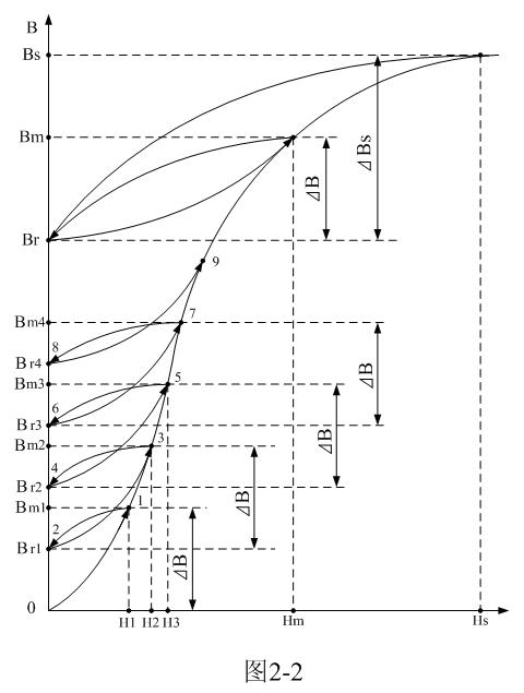 經(jīng)過(guò)n個(gè)直流脈沖電壓之后,變壓器鐵芯中的最大磁通密度Bm和剩余磁通密度Br才能基本穩(wěn)定在某個(gè)數(shù)值之上,即:脈沖序列的作用達(dá)到穩(wěn)定狀態(tài)后,磁化過(guò)程將沿原始曲線(xiàn)上某一固定局部磁滯回線(xiàn)n點(diǎn)重復(fù);這時(shí)剩余磁通密度為Br n(Br n= Br),磁通密度變化無(wú)論磁場(chǎng)強(qiáng)度增長(zhǎng)或降低,其ΔB值基本不變。