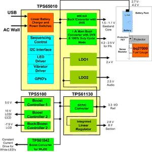 在此解決方案中,3.3VI/O電源是由SEPIC轉(zhuǎn)換器提供,它讓應(yīng)用系統(tǒng)能充份利用鋰離子電池電力,直到電池電壓降至最低水平(大約2.7V)。和離散解決方案一樣,穩(wěn)壓器輸出也來(lái)自3.3V輸入電源,以便提高工作效率。TPS65010采用48只接腳QFN封裝,這些組件都內(nèi)建FET晶體管。TPS61130SEPIC轉(zhuǎn)換器采用4×4平方厘米QFN封裝,并且內(nèi)建FET晶體管,最高達(dá)到90%以上效率,TPS5100則是三通道輸出控制器,專門用來(lái)提供電源給顯示器。功率放大器和中央處理器電源使用的動(dòng)態(tài)電壓調(diào)整技術(shù)可以改善每顆零件的效率,進(jìn)而協(xié)助降低功耗。