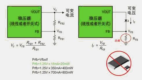 一般來說,DC/DC穩壓器對VFB的變化有一個感知的范圍,一旦LED選定,其工作電流IF的大小也就確定了,所選的電阻要保證VFB落在DC/DC穩壓器容許的范圍內。