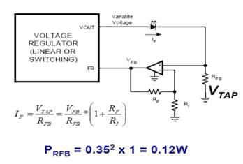 考慮運算放大器本身的功耗,RFB及其附屬電路的功耗大約為1WLED功率的12%。這樣就能在確保LED獲得恒流供電的同時,將RFB的功耗降低到可以接受的水平,從而使LED兩端的電壓盡可能大,流經的電流也盡可能大。國家半導體按照這個原理工作的穩壓器有LM2736和LM2734。