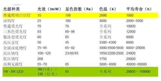 表1:大功率LED在壽命上具有很大優勢。