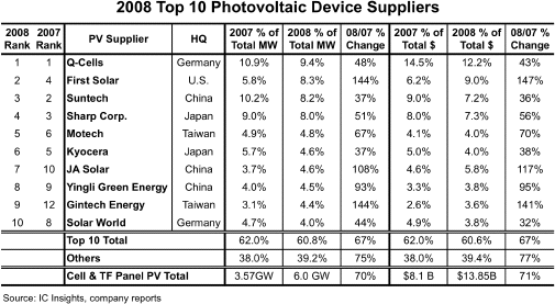 供應量位居第三的是上年排名第二的尚德太陽能電力有限公司(Suntech Power Holdings),上年排名第三的夏普以與尚德的0.2個百分點之差下滑至第四。不過,在銷售額方面夏普位居第三,尚德以0.1個百分點之差退居第四。IC Insights評價夏普的薄膜硅太陽能電池增產及擴大銷售的計劃“很有野心”,并預測如果按照計劃推進,夏普將有望盡快奪回市場份額。