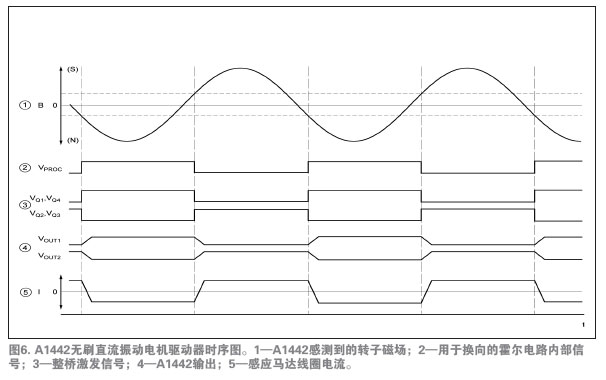 A1442是驅(qū)動(dòng)馬達(dá)唯一必須的的IC。圖5所示的功能模塊圖說(shuō)明了設(shè)備運(yùn)行和先進(jìn)的特性。注意圖4和圖5中,采用集成的霍爾傳感器免除了外部霍爾傳感器,從而減少了馬達(dá)PCB元件數(shù)量。唯一所需的外部元件是一種標(biāo)準(zhǔn)電路特性——位于應(yīng)用馬達(dá)安裝PCB上的0.1µF的旁路電容,它用于降低在開關(guān)電源的電感負(fù)載時(shí)產(chǎn)生的瞬時(shí)電壓峰值。