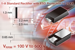 新器件的目標應用是汽車和工業控制、傳感器單元,以及照明系統。設計者可以根據所需,從100V(MSE1PB)、200V(MSE1PD)、400V(MSE1PG)和600V(MSE1PJ)中挑選合適的反向電壓等級。所有這些器件都具有1A的平均前向電流和20A的前向浪涌電流。