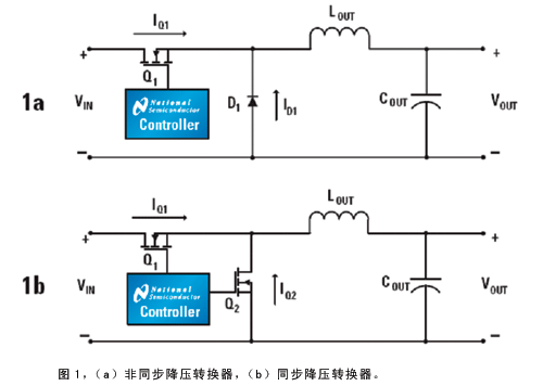 圖1是非同步和同步降壓轉換器的原理圖。非同步降壓轉換器使用FET和肖特基二極管作為開關器件(圖1a),當FET打開時,能量傳遞到輸出電感和負載。當FET關斷,電感中的電流流過肖特基二極管。如果負載電流高于輸出電感的紋波電流的一半,則轉換器工作在連續導通模式。