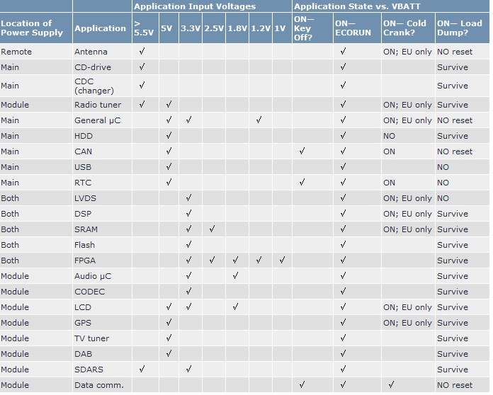 大多數(shù)系統(tǒng)電源的基本架構(gòu)選擇應(yīng)從電源要求以及汽車廠商定義的電池電壓瞬變波形入手。對于電流的要求應(yīng)該反映到電路板的散熱設(shè)計。表1歸納了大多數(shù)設(shè)計的電路及電壓要求。