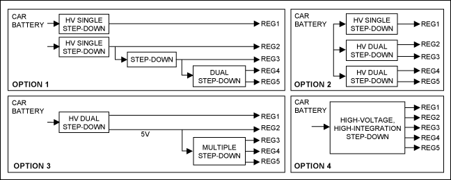 以下列出了四種常用的電源架構(gòu),總結(jié)了最近三年汽車領(lǐng)域的典型設(shè)計架構(gòu)。當然,用戶可以通過不同方式實現(xiàn)具體的設(shè)計要求,多數(shù)方案可歸納為這四種結(jié)構(gòu)中的一種。