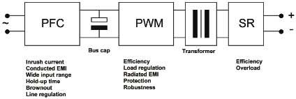 功率因數(shù)校正級(PFC),加上總線或DC鏈路電容,對于許多無法單獨(dú)優(yōu)化的不同因素來說是十分關(guān)鍵的?,F(xiàn)在,大部分電源都采用了有源PFC電路,亦即升壓轉(zhuǎn)換器,確保輸入電流與輸入電壓同相,使輸入端的正弦波失真最小化,從而減小傳導(dǎo)EMI,實現(xiàn)寬輸入范圍(85VAC~265VAC)。