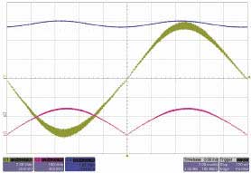 此外,它的功率要求很低,既提高了效率也降低了組件成本。該P(yáng)FC還帶有峰值限流、輸入電壓中斷保護(hù)功能,還有一個過壓比較器,可在發(fā)生負(fù)載突然減小事件時關(guān)斷PFC部分。時鐘輸出信號可用來同步下游的PWM級,以減少系統(tǒng)噪聲。圖3中,綠色曲線的較厚區(qū)域代表電流紋波,PFCIC在峰值輸入電壓下消耗電流較多,過零時沒有電流。粉色曲線代表整流器輸入電壓,藍(lán)色曲線為輸出電壓。