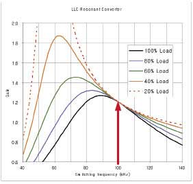利用PFC級,LLC轉(zhuǎn)換器的輸入可設(shè)置在400V左右。如果所需輸出電壓為12V、匝數(shù)比為40:1,則額定負(fù)載下需要1.2的DC增益。無論負(fù)載情況如何,頻率始終不變。
