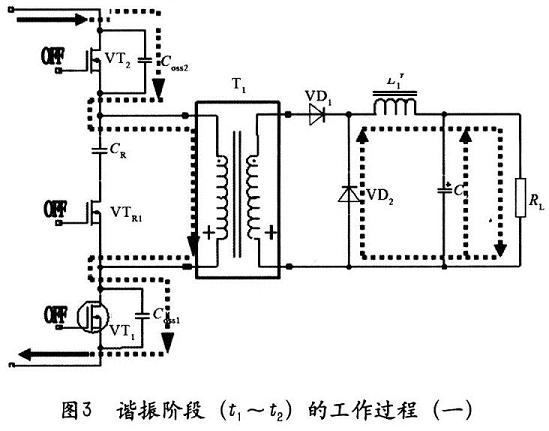 2)諧振階段(t1~t2),如圖3所示,在占空比的控制下,第一主開關管VT1和第二主開關管VT2在t1時刻同時關斷,變壓器磁芯極性反轉。因輸入電源和變壓器的勵磁電感的作用給VT1和VT2的寄生電容COSS1,COSS2充電,由于電容電壓不能突變,第一主開關管VT1和第二主開關管VT2在ZVS狀態(tài)下關斷。同時變壓器的勵磁電流開始給鉗位開關管VTR1的寄生電容COSS放電,經VTR1的體二極管給鉗位電容CR1充電。次級VD1截止,VD2導通,L1經過VD2續(xù)流繼續(xù)給負載RL供電。