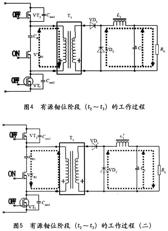 3)有源鉗位階段(t2~t3),如圖4和圖5所示,在亡2時刻鉗位開關管VTR在ZVS狀態(tài)下開啟,由于VTR1的體二極管先前已開通,VTRl的UDS電壓很低。鉗位開關管VTR1在整個階段處于開通狀態(tài),變壓器勵磁電流經過鉗位開關管VTR1繼續(xù)給鉗位電容CR1充電,鉗位電容CR1充滿以后經變壓器勵磁電感放電。次級在整個階段由L1續(xù)流經VD2給負載供電,VD1截止。