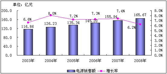 2008年中國電源市場銷售額165.67億元,同比增長6.2%,受全球金融危機影響,電源市場銷售額增長率在近幾年中首次出現下滑。自2003年以來,隨著各行業信息化建設的不斷深入,中國電源市場一直處于穩定發展態勢。2008年中國電源產品產量3163萬臺,同比增長5.7%。