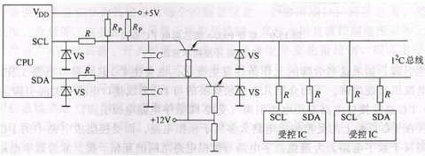 直接式I2C總線是指被控集成電路直接或通過電阻掛在I2C總線上,其電路工作原理圖如圖4所示。因?yàn)镃PU的I2C總線輸出端口內(nèi)部電路形式為集電極開路(或漏極開路)形式,所以在CPU的I2C總線輸出端必須通過上拉電阻R接+5V電源,為CPU的I2C總線輸出端口的內(nèi)部電路供電。圖4中的電阻R為隔離電阻,C為抗干擾電容,主要是為了提高I2C總線上數(shù)據(jù)傳輸?shù)目煽啃裕乐拐`動(dòng)作進(jìn)人維修狀態(tài)和防止由于外部干擾信號(hào)改變I2C總線數(shù)據(jù)。穩(wěn)壓管VS是為了防止外部高電壓損壞CPU的I2C總線輸出端的內(nèi)部電路。
