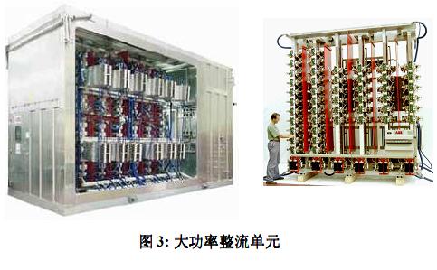 在整流應用中,由于沒有再生負載,額定電壓選擇依據整流器輸入線電壓。如果與3英寸或4英寸二極管或晶閘管配合使用,可以形成的整流器輸出為直流2100V,將可允許在一條生產線上有440只電解槽串聯,這等效于每年39萬噸鋁的生產能力。