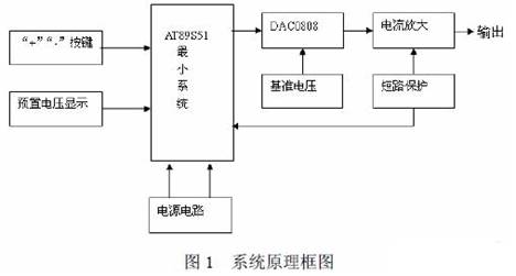 本系統(tǒng)是以AT89S51 單片機(jī)為核心控制器,具有電壓可預(yù)置、可步進(jìn)調(diào)整、輸出的電 壓信號和預(yù)置的電壓信號可同時顯示的數(shù)控直流電源,其硬件原理方框圖如圖1 所示。系統(tǒng) 由AT889S51 控制電路、鍵盤電路、電源電路、D/A 電路、功放電路、短路保護(hù)及報警電路、 穩(wěn)壓輸出電路、LED 顯示電路八部分組成。系統(tǒng)通過“開關(guān)”、“+”、“-”三個按鍵來控制預(yù)置電壓的升降,并通過數(shù)碼管顯示。AT89S51 單片機(jī)送出相應(yīng)的數(shù)字信號,在D/A 轉(zhuǎn)換之 后輸出電流,經(jīng)集成運(yùn)放LM358 轉(zhuǎn)換、三極管放大、RC 網(wǎng)絡(luò)濾波,最終穩(wěn)定。同時由LED 數(shù)碼管顯示輸出電壓;由數(shù)字電壓表測量實(shí)測值。
