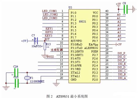 主要由AT89S51 最小系統(tǒng)控制,它要完成鍵盤控制、預(yù)置電壓顯示控制、短路保護(hù)控制 及報警控制等功能。AT89S51 最小系統(tǒng)如圖2 所示。
