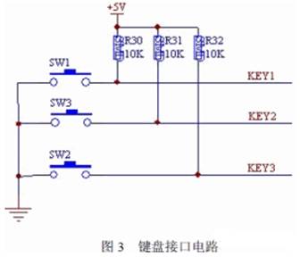 鍵盤接口電路如圖3 所示。鍵盤設(shè)計由三個按鍵控制即:“開關(guān)”鍵、“+”鍵、“-”鍵, 并外接三個上拉電阻控制鍵盤去抖。此三鍵分別連接到單片機(jī)的P1.0、P1.1、P1.2 接口進(jìn)行控制。
