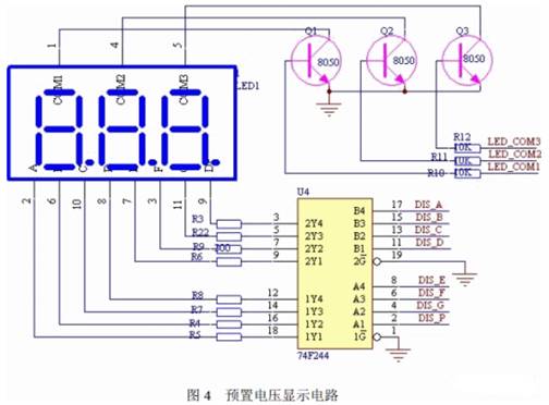 預(yù)置電壓顯示電路如圖4 所示。本設(shè)計選用譯碼驅(qū)動器74F244,用來驅(qū)動LED 數(shù)碼管 顯示預(yù)置電壓,分別由單片機(jī)P2.0~P2.7 接口控制。LED 共陰極控制端由P1.4~P1.6 接口 控制,并用三極管8050 來控制LED 的顯示。