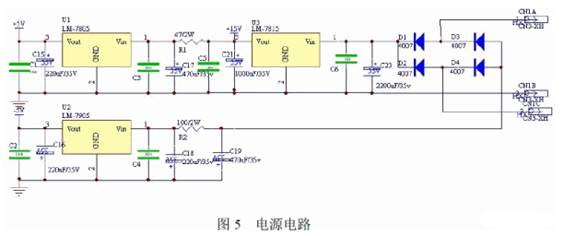 電源部分輸入220V、50Hz 交流電,輸出全機(jī)所需的三種電壓:+5V、+15V、-5V,主要供數(shù)控部分和D/A 轉(zhuǎn)換芯片使用;+15V 作為運(yùn)放的正電源,同時也是穩(wěn)壓輸出電路的主電源。該電源模塊部分拓展了-5V 負(fù)電壓,同時作為運(yùn)放的負(fù)電源,如圖5 所示。