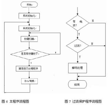 軟件控制程序由主程序和過流保護(hù)程序兩部分,其主要實(shí)現(xiàn)步進(jìn)加減、D/A 轉(zhuǎn)換、鍵盤 掃描、LED 顯示、電流報警等功能。