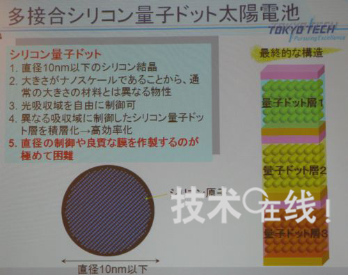 東京工業(yè)大學(xué)教授小長井誠研究小組,大幅提高了利用硅量子點(diǎn)的太陽能電池的開放電壓(Voc)及I-V特性形狀因子(FF)數(shù)值。2010年3月10日,該消息是在應(yīng)用物理學(xué)會(huì)舉行的2010年春季應(yīng)用物理學(xué)會(huì)學(xué)術(shù)演講會(huì)的會(huì)前新聞發(fā)布會(huì)上宣布的。