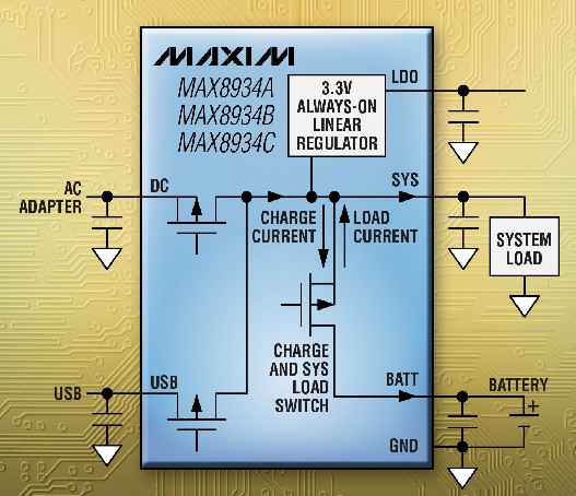MAX8934可以采用獨(dú)立的USB和交流適配器電源輸入供電,也可用單個(gè)輸入連接兩種電源。直流輸入限流值最高可調(diào)節(jié)至2A,USB輸入限流值最高可調(diào)節(jié)至1.5A*。直流與USB輸入均支持100mA、500mA、1.5A和USB掛起模式。充電電流最高可調(diào)節(jié)至1.5A,支持較寬范圍的電池容量。器件的其它特性包括:防止過(guò)熱的熱調(diào)節(jié)環(huán)路、自適應(yīng)電池充電功能在滿足系統(tǒng)負(fù)載供電的前提下為電池充電、OVP (過(guò)壓保護(hù))、漏極開(kāi)路充電狀態(tài)和故障指示輸出、電源就緒監(jiān)測(cè)器、充電定時(shí)器以及電池溫度監(jiān)測(cè)器。