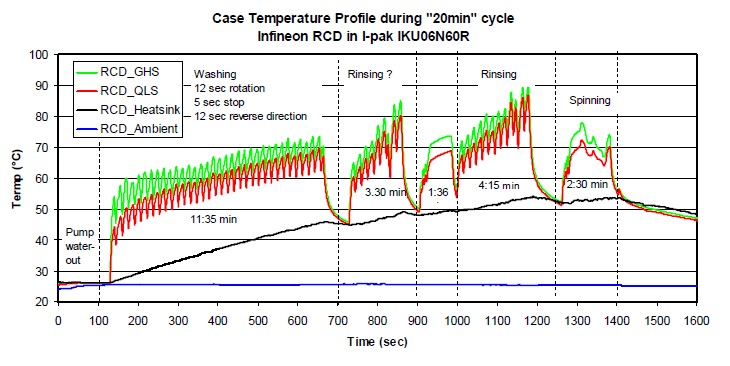下面就是為了驗(yàn)證這種逆向?qū)ㄐ虸GBT在實(shí)際應(yīng)用當(dāng)中的一個(gè)表現(xiàn),我們?cè)谝粋€(gè)洗衣機(jī)上面驗(yàn)證了6安的IPARK的產(chǎn)品,在一個(gè)風(fēng)機(jī)上面我們驗(yàn)證了6安的DPARK的產(chǎn)品。這是一個(gè)實(shí)際的洗衣機(jī)的控制板,這種方式就是采用了夾子,然后把這個(gè)IGBT夾在散熱器上面。稍候我們會(huì)用這種IPARK的封裝對(duì)這種TO220的封裝做一些替代,然后比較一下他們的不同。就是說我們把其中的一路替代成IPARK產(chǎn)品,然后做一個(gè)效率還有溫度的檢測(cè),通過這種熱電偶的方式來檢測(cè)它的表面溫度,來檢測(cè)它的結(jié)溫。因?yàn)樗饷嬗幸粋€(gè)夾子,我們沒有辦法用紅外相機(jī)來檢測(cè)它的溫度,所以我們采用了這種熱電偶的方式。這個(gè)是洗衣機(jī)的工作流程,首先的話是抽水,這個(gè)是洗滌,這個(gè)是漂洗,這個(gè)是甩干,整個(gè)20分鐘的流程當(dāng)中它的溫度的表現(xiàn),基本上它的最高溫度沒有超過90度,我們可以看到這個(gè)綠色和紅色有一點(diǎn)稍微小小的區(qū)別,這是因?yàn)樗纳岵灰粯樱琁GBT的位置放在不一樣,所以會(huì)有一點(diǎn)不一樣,這個(gè)不用太過擔(dān)心。