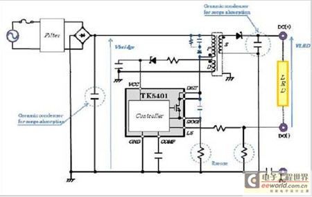 創(chuàng)意電子新近推出的TK5401就是這樣一款LED驅動電源IC,它具有不需要DC電源特性中所必須的電解電容的特性,使得LED壽命高達4萬小時以上。據(jù)介紹,TK5401封裝內置了高電壓功率MOS管及控制電路,因去除電解電容實現(xiàn)了小型化、低成本,并且實現(xiàn)了LED燈的長壽命和高效能。