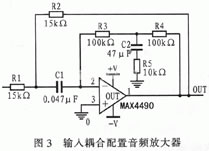 圖3所示音頻放大器采用了一種新穎的交流耦合方式,它與傳統的耦合電路配置相比只需要非常小的耦合電容器。圖中輸入電容器(C1)的容量僅為0.047μF。因此,我們可以采用電壓系數非常低的COG/1206陶瓷電容器這樣可以最大限度地降低電壓系數的影響。運算放大器(必須采用低偏置電流的放大器,例如MAX4490型)的直流反饋由兩個100kΩ的電阻器(R3和R4)組成,C2和R5用來衰減直流反饋環路的音頻頻率。主要音頻反饋元件為R1、R2和C1三個無源元件。根據圖中所示的元件值,該電路的-3db截止頻率設置在5Hz。