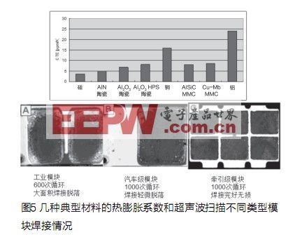 IGBT模塊由多層不同材料組成(見圖3),每種材料具有不同的CTE(熱膨脹系數),CTE的差別會影響功率模塊的使用壽命,當模塊使用時,溫度的變化會在不同層間產生機械應力而導致焊接脫落,我們的目標是選用熱膨脹系數差別盡可能小的材料來進行焊接組合。但另一方面,即使它們的熱膨脹系數十分匹配,因為材料本身的成本可能會太高,或者在生產過程中難以被加工或加工成本太高。例如列車牽引應用中的AlSiC基板。熱膨脹系數和襯底幾乎相同,因此有更好的熱循環(huán)特性。但對混合動力車應用因成本過高而很難被接受。
