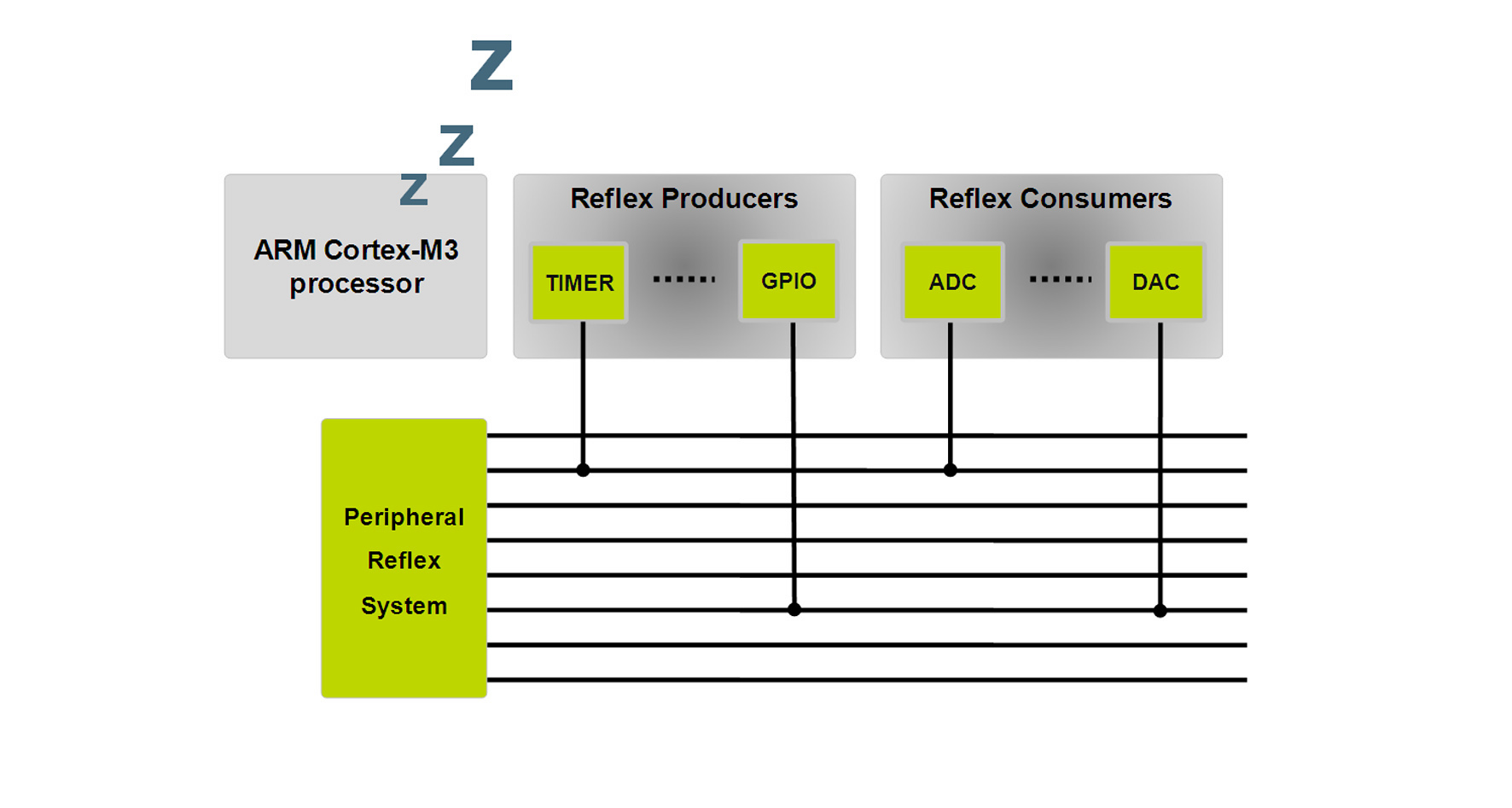 圖6.使用Energy Micro的''''''''''''''''外圍設備反射系統—一個復雜的互聯矩陣—就可以執行簡單的任務如開始數據轉換和存儲結果,完全無需喚醒32位處理器內核。