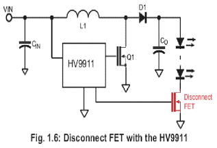 這個放電電容同時也會使得電路重新連接動作時,LED電流的上升時間會被拉長。因此,避免輸出電容的放電是相當重要的。IC輸出FAULT信號斷接FET,使得LED的電流幾乎立刻的下降到零電流,因此輸出電容并沒有被放電,所以當PWMD信號回復High位準時輸出電容不需要額外的充電電流,這使得上升時間非常快速。