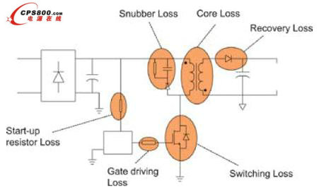 圖1給出反激式開關電源在待機狀態下的主要損耗類型,其中功率管開關損耗、驅動損耗、變壓器磁芯損耗、輸出整流管反向恢復損耗以及緩沖器損耗都屬于開關損耗。各種類型的開關損耗都與開關頻率有關,降低開關頻率可以減少開關損耗。控制電路的損耗主要表現為啟動電阻上的損耗,而啟動電阻的損耗直接與整流后的直流母線電壓和啟動電阻值。在保證寬電壓輸入的工作條件下可以通過降低啟動電流的方法來降低啟動電阻損耗。