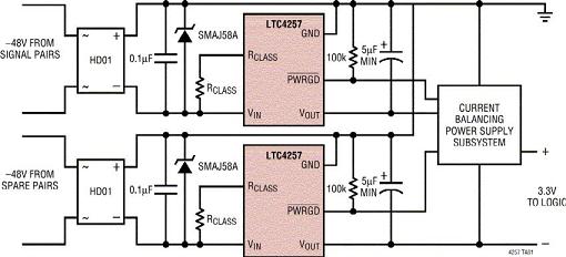 四對(duì)PD電路是最大的變化(圖4b)。現(xiàn)在需要采用兩個(gè)LTC4257器件,電源電路必須具備足夠的智能,以便把從每一個(gè)通道吸取的電流限制在802.3af規(guī)范容許的范圍之內(nèi)。要做到這一點(diǎn),就要平衡從每一對(duì)線吸取的電流或平衡從每一對(duì)線吸取的功率,直到它接近(但是不超過(guò))ICUT極限,然后,才從其它線對(duì)吸取電流。這種電路可能相當(dāng)復(fù)雜,不同的設(shè)計(jì)之間差異也很大。