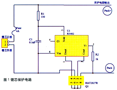 如圖1所示,電芯保護(hù)電路主要由R5402和HAT2027共同組成。除此之外,自恢復(fù)保險絲起到了最后一層保護(hù)的作用。
