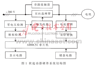 異步電動機智能軟起動器硬件系統結構如圖1所示。本設計采用AT89C51單片機作為整個控制系統的核心。零電壓檢測電路用于檢測相電壓的過零點;觸發電路用其作為同步信號;斷相檢測電路用于判斷斷相故障。觸發電路采用全數字化移相控制電路,與零電壓檢測電路配合,在單片機的控制下,產生移相觸發脈沖來調節電機端電壓;電流檢測電路采用霍爾電流傳感器將電流信號轉換為電壓信號送入A/D轉換器,實現電機定子電流的檢測,提供軟起動和過載保護的依據;顯示控制器用來控制LED,用以顯示工作參數和狀態;鍵盤電路用于輸入系統的參數和控制單片機程序的走向。主要電路的設計說明如下。