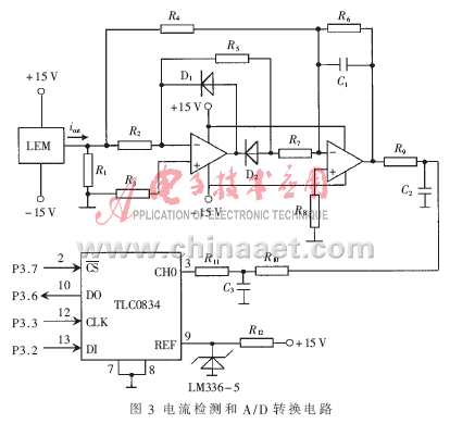 軟起動的主要任務是控制主電路的電流,因此要對電流進行檢測和監控。電流檢測和A/D轉換電路如圖3所示。本裝置采用LEM電流傳感器進行主回路電流的檢測,其主要優點是LEM電流傳感器可以測量任意波形的電流及瞬態峰值,副邊電流能真實地反映原邊電流的波形,原邊電路與副邊電路之間完全絕緣,可靠性高,而且動態性能好,精度高,因此能夠很好地滿足工業現場應用的需要。為減小誤差保證轉換精度,沒有采用傳統的橋式二極管整流電路對LEM模塊輸出的電流進行整流,而是采用由2個運放組成的精密全波整流電路進行整流并濾波,得到與交流電流成比例變化的0~5V的直流電壓信號送入A/D轉換器TLC0834轉換成二進制數送入單片機,以此信號作為改變晶閘管觸發角大小的依據,并用于數碼管顯示。TLC0834是8位串行控制模數轉換器,以5V作為基準電壓,通過與控制處理器相連的串行數據鏈路傳送控制命令,用軟件對通道選擇和輸入端進行配置。多路器尋址通過TLC0834的DI端移入轉換器。TLC0834的DI、CLK、DO和/CS分別與單片機的P3.2、P3.3、P3.6和P3.7端口連接。程序中置/CS為低,使TLC0834能夠工作,并對轉換器初始化;然后從處理器接收1個時鐘,在每個時鐘的上升跳變時,DI端的數據移入多路器地址移位寄存器。在轉換過程中,轉換數據同時從DO端輸出。這樣TLC0834將輸入電壓轉換成二進制數送入單片機后進行處理和顯示。