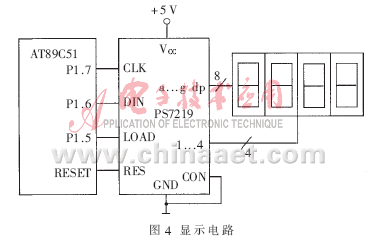 顯示電路如圖4所示,由高性能的多位LED顯示驅動器PS7219控制。PS7219內部具有15×8BRAM功能控制器寄存器,尋址方便;其復位引腳與單片機的復位端連接,LOAD、DIN和CLK端分別與單片機的P1.5、P1.6和P1.7端口連接。LOAD腳的功能是裝載數據輸入,當它為高電平時,串行輸入數據的最后16位被鎖定。串行數據的傳送格式為D15~D0,其中D15~D12為無關位,D11~D8為寄存器地址,D7~D0為數據位;DIN腳的功能是串行數據輸入,發送到DIN端的16位數據在每個CLK的下降沿被移入到內部16位寄存器中;然后,在LOAD的上升沿,數據被鎖存到數值或控制寄存器中。