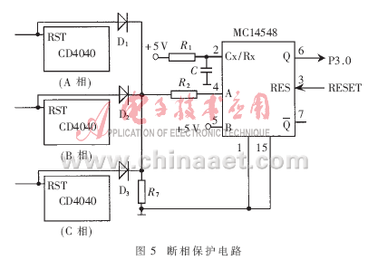 斷相是對電動機危害較大的一種故障,為此系統單獨設置了如圖5所示的斷相保護電路,主要由摩托羅拉單穩態觸發器MC14548和3只二極管組成的“或門”電路實現。斷相保護示意圖如圖6所示。MC14548由上升沿觸發,產生1個脈寬由外加定時元件電阻R1和電容C決定的輸出脈沖。當MC14548的A端出現1個上升沿、B端為高電平時,Q端(平時輸出低電平)輸出1個由低到高的脈沖,經過時間τ(τ=R1×C)后從高變低。分別來自A、B、C相觸發電路中計數器CD4040的RST端的3個信號經“或門”電路與MC14548的A端相連。因三相電源電壓相位互差120°,故接入A、B、C三相回路的3個雙光耦TLP521每60°就有1次過零,過零時3個計數器CD4040的RST端一定有1個呈高電平,經過“或門”后MC14548的4腳每60°就有1個上升沿脈沖。若設定時間常數τ的值在大于60°而小于120°所對應的時間為:3.3ms<τ<6.6ms,則不缺相時,單穩態觸發器將始終處于暫態,MC14548的Q端始終輸出高電平,此時觸發器的工作狀態如圖6(a)所示;若斷相,MC14548的A端將出現隔120°才出現下一個脈沖的情況,此時MC14548的Q端將從暫態回到穩態,呈現低電平,此時觸發器的工作狀態如圖6(b)所示。將MC14548的Q端連至單片機的P3.0端口,由程序檢查P3.0端口,如為零則說明斷相,然后進行斷相處理。