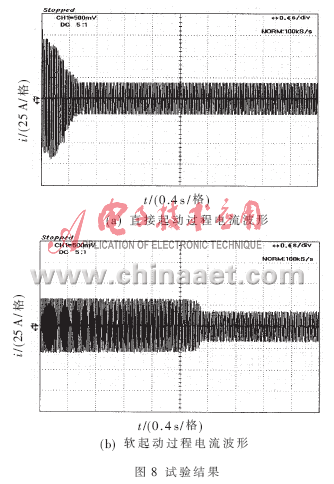 圖8為電機起動過程實測電流波形,圖8(a)為直接起動過程電流波形,圖8(b)為軟起動過程電流波形。可見整個軟起動過程中電流的變化很平穩,沒有出現振蕩現象,電機軟起動時的起動電流是其穩定運行電流的2倍左右,而直接起動非常迅速,啟動電流很大,直接起動時的起動電流是其穩定運行電流的5~7倍。試驗結果表明,所設計的軟起動器系統效果良好,起動過程平穩,無沖擊和振蕩。