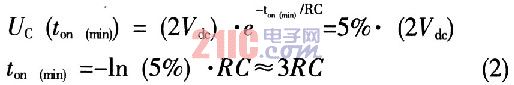 因此,從式(1)和式(3)便能計算出電容C的大小。在確定了C后,而最小導(dǎo)通時間已知,這樣,通過式(2)就可以得到電阻R的大小。