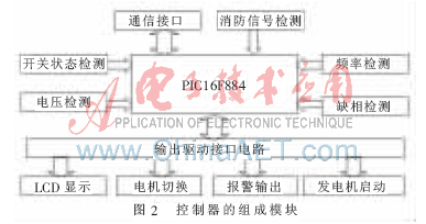 智能型雙電源開(kāi)關(guān)控制器以單片機(jī)PIC16F884為核心,對(duì)兩路供電電源(常用電源和備用電源)的電壓、頻率和相位進(jìn)行實(shí)時(shí)檢測(cè)。當(dāng)其中一路電源(常用電源或備用電源)的電壓發(fā)生過(guò)壓、欠壓或是缺相時(shí),控制器就會(huì)發(fā)出電機(jī)切換命令,使供電電源自動(dòng)切換到另一路電源(備用電源或常用電源)上,以此來(lái)保障供電的連續(xù)性。控制器的工作方式主要有自動(dòng)方式和手動(dòng)方式兩種??刂破鞯慕Y(jié)構(gòu)框圖如圖1所示,組成模塊如圖2所示。