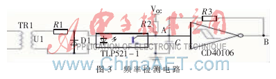 單片機(jī)對(duì)常用和備用電源進(jìn)行頻率檢測(cè),根據(jù)檢測(cè)的結(jié)果來(lái)判斷電源是否發(fā)生故障,然后進(jìn)行相應(yīng)的控制操作。頻率檢測(cè)電路主要以光耦TLP521-1和施密特觸發(fā)器CD40106為主要器件構(gòu)成。頻率檢測(cè)的硬件電路如圖3所示。電網(wǎng)中的交流電經(jīng)變壓器后變換為電壓較低的交流信號(hào)U1,U1經(jīng)過(guò)光耦TLP521-1后就變成了同頻率的方波信號(hào)。為了防止光耦內(nèi)部的二極管被反向電流擊穿,在光耦外部反向接了1個(gè)二極管。為了使光耦輸出的方波信號(hào)更加規(guī)整,為單片機(jī)測(cè)量頻率做好準(zhǔn)備,在光耦的輸出級(jí)加了施密特觸發(fā)器CD40106。利用PIC16F884單片機(jī)的輸入捕捉(CCP)功能記錄第一個(gè)上升沿的時(shí)間t1和下一個(gè)上升沿的時(shí)間t2,則信號(hào)的周期T=(t2-t1)μs。為了提高測(cè)量的精度,采用多次測(cè)量取平均值的方法來(lái)實(shí)現(xiàn)。