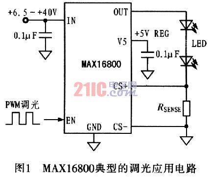 圖1為MAXl6800典型的調(diào)光應(yīng)用電路。MAXl6800具有高輸入電壓范圍(達(dá)40V),可直接連接到汽車電池而不需要保護(hù)器件,保護(hù)器件一般用來抵御電池負(fù)載變化帶來的浪涌電壓。MAxl6800能夠為LED提供恒定電流,電流值可以通過與LED串聯(lián)的檢流電阻RSENSE設(shè)置。為了提高電流設(shè)置精度,提高對外部噪聲的抑制能力,MAXl6800采用差分電流檢測輸入方式。