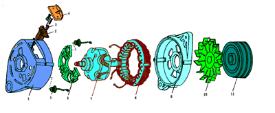 11管交流發(fā)電機(jī)的整流器由8只大功率整流二極管(其中2只中性點(diǎn)二極管)和3只磁場二極管組成。其它結(jié)構(gòu)和6管交流發(fā)電機(jī)相同。