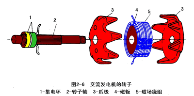 轉(zhuǎn)子軸上壓裝著兩塊爪極,兩塊爪極各有六個(gè)鳥嘴形磁極,爪極空腔內(nèi)裝有磁場繞組(轉(zhuǎn)子線圈)和磁軛。集電環(huán)由兩個(gè)彼此絕緣的銅環(huán)組成,集電環(huán)壓裝在轉(zhuǎn)子軸上并與軸絕緣,兩個(gè)集電環(huán)分別與磁場繞組的兩端相連。