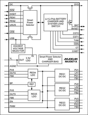 因?yàn)镸AX8671X可以無(wú)縫管理USB和交流適配器電源,使得制造商能夠省去AC/DC墻上適配器充電零配件,從而降低了系統(tǒng)成本。其集成了眾多功能:電池充電器、適配器-USB-電池開關(guān)、系統(tǒng)電壓調(diào)節(jié)以及各種檢測(cè)功能(見圖1)。5路獨(dú)立的集成穩(wěn)壓器(3路2MHz開關(guān)降壓型調(diào)節(jié)器,效率高達(dá)96%;2路低靜態(tài)電流的線性穩(wěn)壓器)可以為多個(gè)子系統(tǒng)提供高效供電。