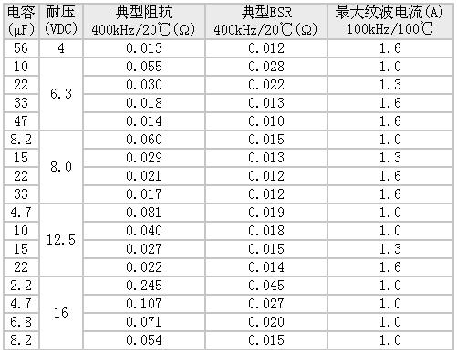 ESRD及ESRE兩個(gè)系列的電解電容具有極好的高頻特性,允許大的紋波電流,電容量允差±20%(精度為M級),等效串聯(lián)電阻ESR小,ESRD電容在100kHz時(shí)為10~45mΩ,ESRE電容在100kHz時(shí)低于10mΩ,400kHz、20℃時(shí)的阻抗為13mΩ到81mΩ,在使用溫度范圍內(nèi)阻抗幾乎不變,工作壽命長,小尺寸貼片式封裝,ESRD的尺寸為7.3mm(長)×4.3mm(寬)×1.8mm(高),而ESER系列的尺寸僅高度尺寸不同,高度為4.2mm,工作溫度為-55℃~+105℃。