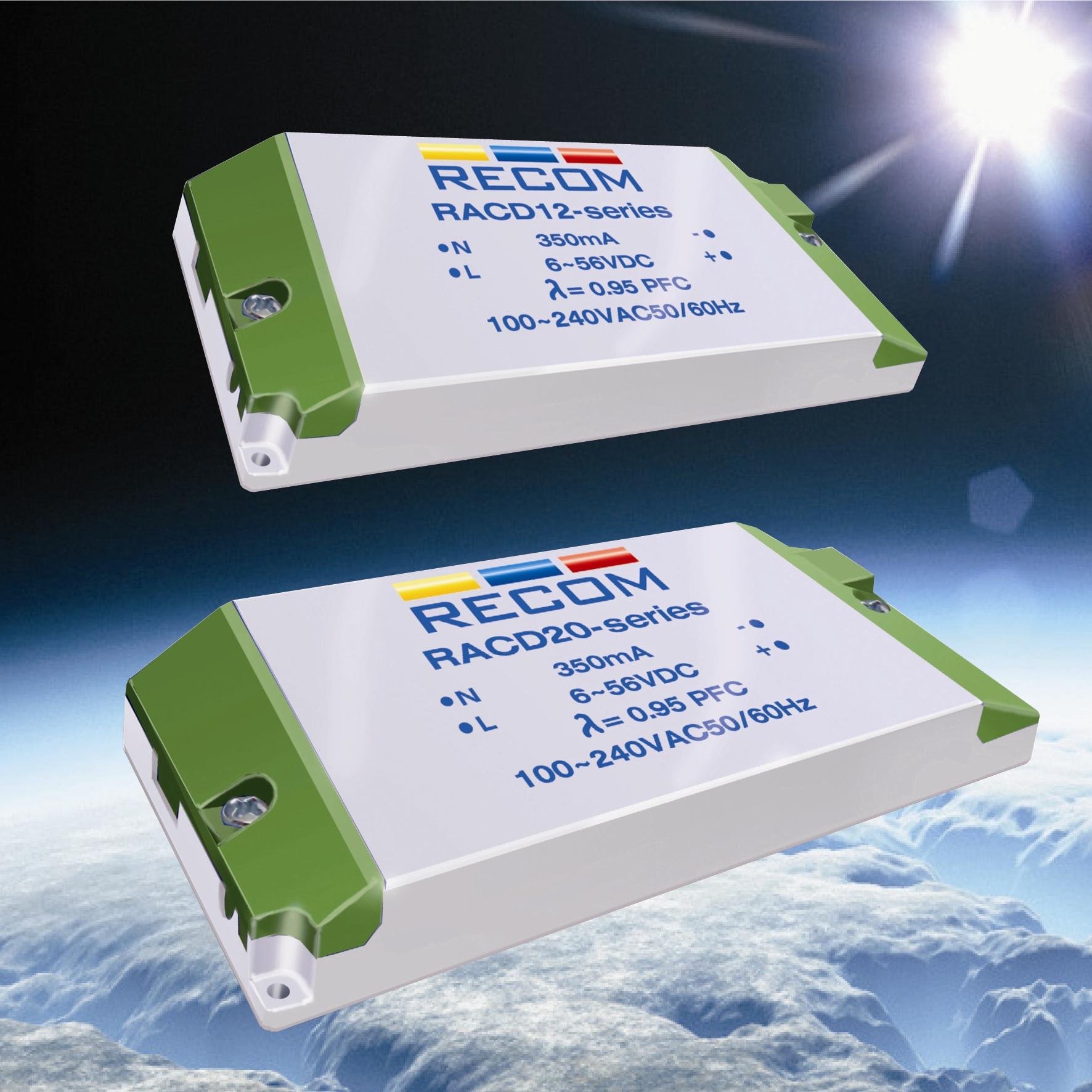 RECOM的全新系列恒流LED驅動器功率在12瓦至20瓦之間,具有通用AC輸入、功率因數校正的特性,并通過UL-8750認證。
